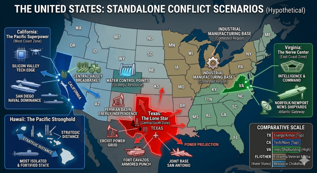 In this scenario, true independence means possessing energy, food, manufacturing, and a world-class military, which is why Texas and California remain the undeniable heavyweights.