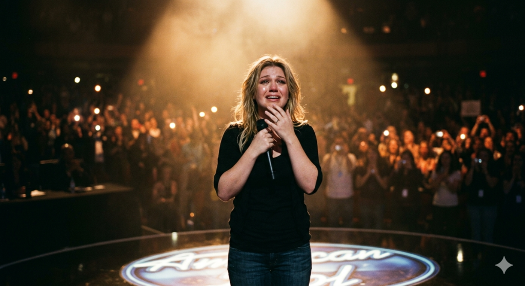 Kelly Clarkson stood there with the kind of stillness that does not come from calm, but from survival. Her hands rested near her sides, not perfectly steady, not trying to be. Her eyes carried the small, stunned distance of someone who can feel the world leaning toward her and still does not quite believe it.
